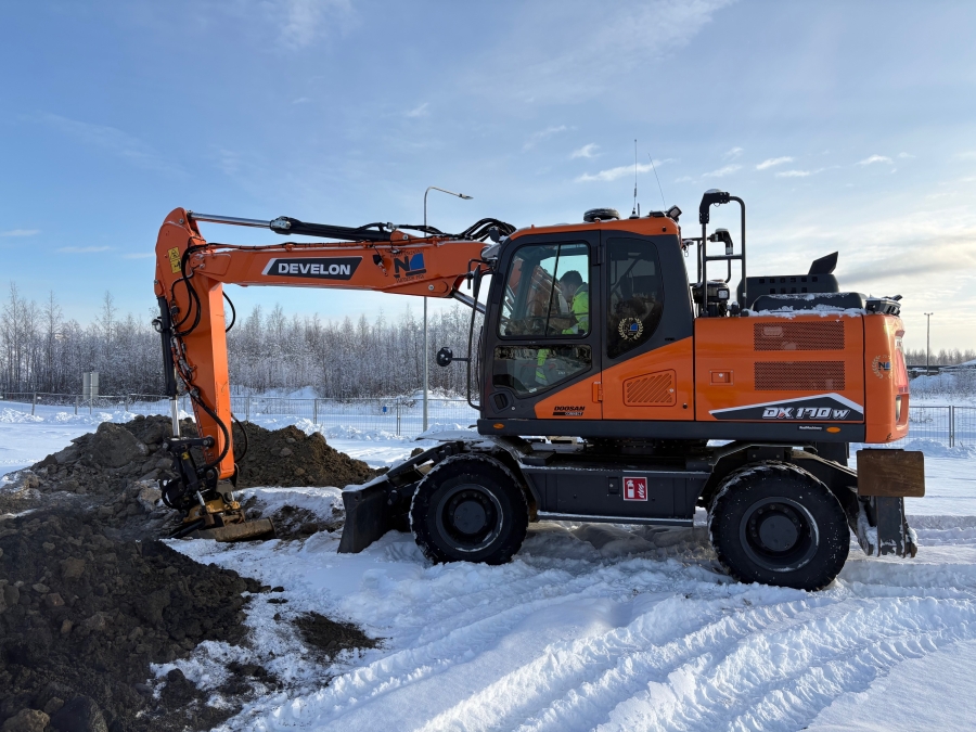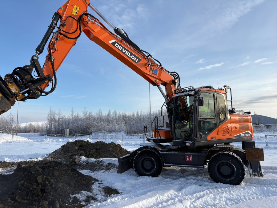 Työpaino n. 19 ton. Pyöräalustainen kaivinkone. Varusteet: kauhoja, puutavarakoura, trukkipiikit. Novatron Xsite kaivunohjausjärjestelmä. |